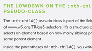Learn how to alternate styles on a series of elements, as well as create a table of contents that highlights the current section of the document, using some new CSS3 pseudo-classes, transitions, and animation.